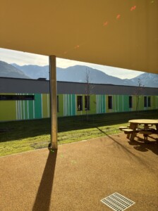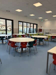 Gli spazi, progettati per garantire benessere e flessibilità, mettono a disposizione ambienti funzionali e moderni per studenti e personale: 10 aule didattiche, ciascuna con la possibilità di svolgere attività all’esterno, 5 laboratori polifunzionali, una palestra, un centro cottura con mensa dedicata, oltre ai locali destinati al corpo docente e al personale scolastico.