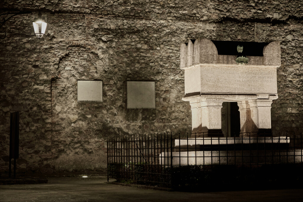 Al centro del sagrato sorge la tomba marmorea che custodisce le spoglie del Petrarca, ricalcante lo stile degli antichi sarcofagi romani. Il monumento funebre è stato illuminato con faretti Lumeitalia Spot ai quattro angoli, con l’obiettivo di esaltare il colore caratteristico del marmo rosso di Verona con cui è stato realizzato.