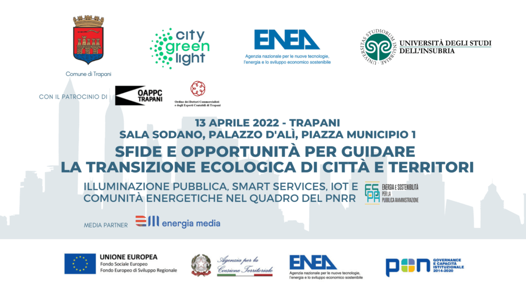 Nell’ambito del Progetto “Energia e sostenibilità per la pubblica amministrazione” (ESPA) , ENEA, Comune di Trapani, City Green Light e il Centro di ricerca Smarter dell’Università dell’Insubria, organizzano un incontro rivolto alle amministrazioni comunali siciliane finalizzato ad un confronto sulle sfide ed opportunità che le soluzioni digitali e la digitalizzazione dei processi gestionali di città e territori oggi aprono alla pubblica amministrazione per il conseguimento degli obiettivi di transizione ecologica nel quadro del PNRR. Da anni ENEA, City Green Light e Insubria, collaborano e svolgono attività di supporto alla Pubblica Amministrazione per la progettazione e realizzazione d’interventi di riqualificazione urbana che puntino alla sostenibilità ed efficientamento energetico delle infrastrutture urbane chiave alla transizione digitale, energetica ed ecologica secondo gli obiettivi previsti dal Progetto ESPA.
