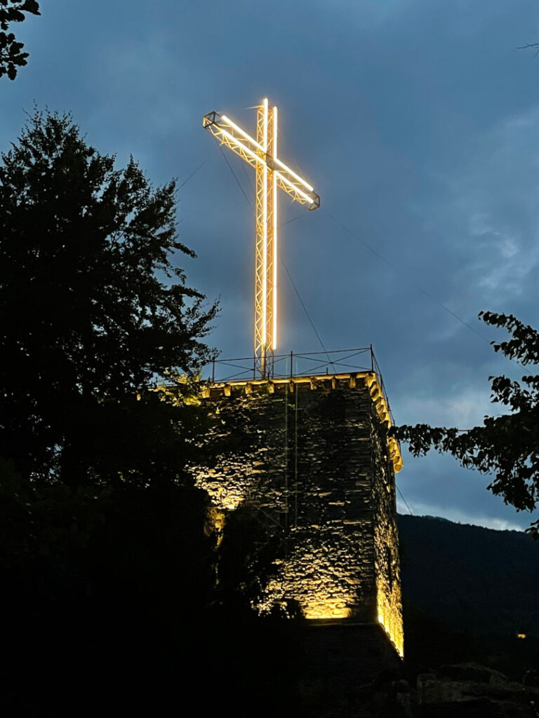 La croce, inserita su una struttura portante, risalta grazie alla sorgente luminosa lineare ad altissima resa della tecnologia Light Joy di Lumeitalia. Questa innovazione consente di delineare con precisione la figura geometrica, visibile anche a distanze considerevoli. Le lampade sono state appositamente personalizzate per l’intervento di efficientamento energetico, con un focus sulla massima efficienza e sostenibilità. Costruite seguendo la filosofia RI-Way di Lumeitalia, promuovono l’economia circolare utilizzando materiali riciclabili o ricondizionabili al termine del loro ciclo di vita. Questo intervento è stato progettato con il massimo rispetto per la storicità del luogo, senza apportare modifiche alle antiche strutture.