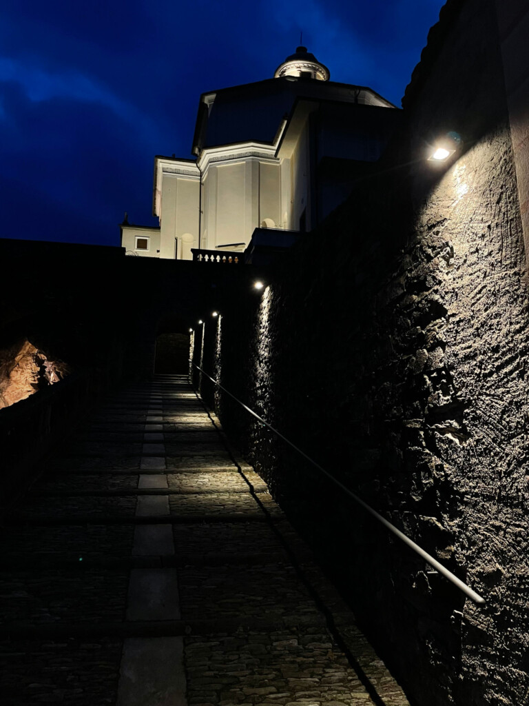Nel perseguire gli obiettivi di riduzione dell’inquinamento luminoso, di promozione del benessere dei visitatori e valorizzazione dell’ambiente e dei monumenti, è stato condotto uno studio approfondito sulle ottiche e sui puntamenti, ottenendo così un risultato esteticamente piacevole e un maggiore comfort visivo. L’illuminazione del complesso architettonico ha permesso di esaltare i contrasti tra le architetture e la natura circostante, creando un contesto suggestivo e armonioso.